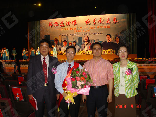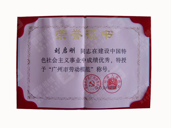 4月28日上午,广州市委大礼堂张灯结彩、锣鼓喧天,一派喜气洋洋。广州市委、市政府庆祝“五一”国际劳动节暨劳动模范和先进集体表彰大会在这里举行。广州市国研机械设备制造有限公司市场部经理刘启刚同志作为天河区6万多家民营企业唯一当选的广州市劳动模范出席了表彰大会。广东省委常委广州市委书记朱小丹、市长张广宁等省市领导亲自为刘启刚等劳动模范颁发广州市劳动模范奖状和荣誉证书并合影留念。