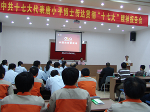 2007年11月14日下午3时,中共十七大代表唐小平博士前来我司宣讲十七大精神,活动在广州市国研机械设备制造有限公司大会议厅举行,参加大会的有广州市天河区组织部、宣传部领导、珠吉街道党工委的领导同志们以及我司全体员工,广东电视台、广州日报等多家媒体派记者前来报道。大会由国研副总经理、党支部书记王声跃主持, 国研董事长、总经理王声位作了热情洋溢的讲话,介绍了国研机械的发展规划以及党支部的建设情况。
